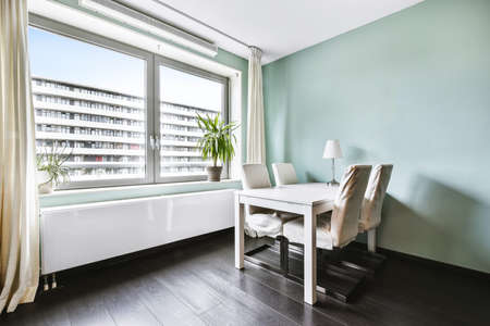 A serene and cozy dining area with natural light illuminating minimalistic decor.