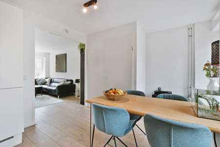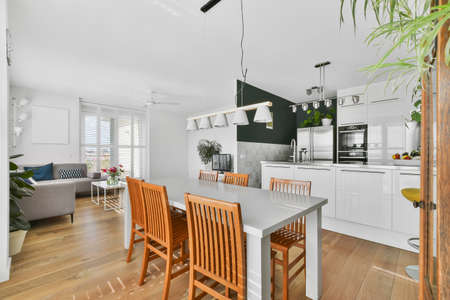 Contemporary minimalist style interior design of light studio apartment with wooden table and chairs in dining zone between open kitchen and living room with white walls and parquet floor