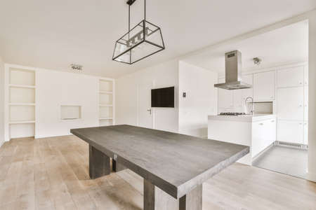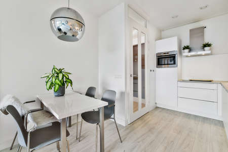 Modern minimalist style interior design of studio apartment with open white kitchen and dining zone with table and chairs illuminated by loft style lamp