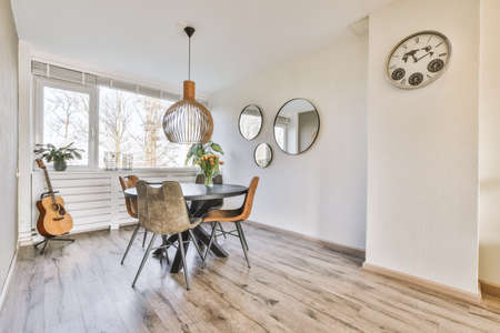 A stylish empty room with a set of table and chairs ,decorative mirrors on the wall