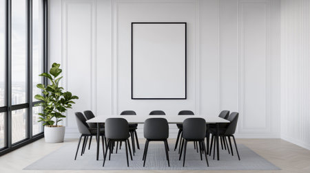 A modern conference room featuring a large table, black chairs, a blank wall for artwork, and a view through large windows, creating a bright, professional atmosphere.