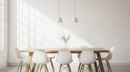 A stylish minimalist dining area with a simple wooden table, white chairs, and a single pendant light hanging above the table.