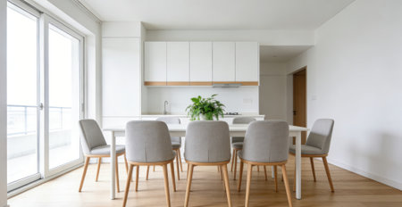 Minimalist white and pine wood dining area with clean lines, green plant decor, and functional layout