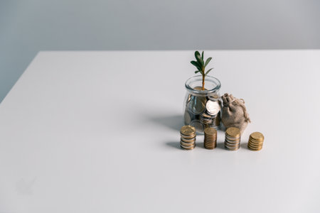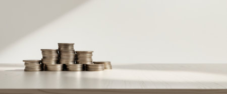 A series of coins organized in progressively taller stacks, representing financial growth and investment potential, set against a minimalistic light background.