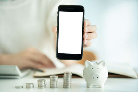 blank screen smartphone. Money saving and investment concept. Young woman showing a mockup empty blank screen of smartphone with her money saving.