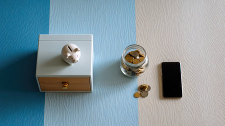 This stock photo captures a modern financial planning setup featuring a piggy bank, a jar of coins, and a smartphone on a stylish blue background, symbolizing saving and budgeting.