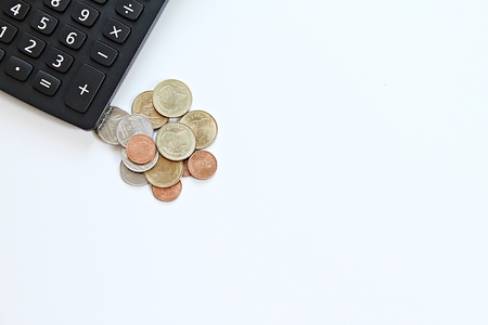 Business, finance, savings money, investment, taxes or accounting concept : Calculator and coins on white background with copy space ready for adding or mock up
