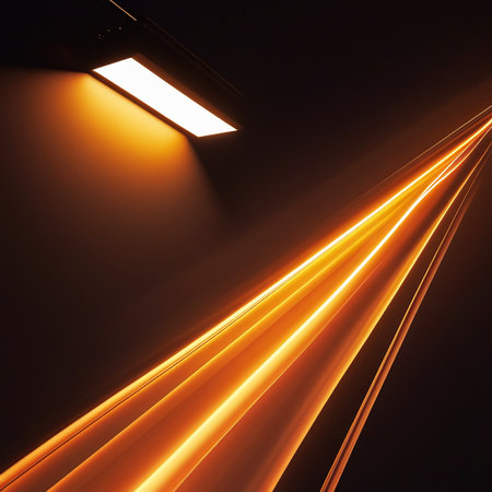 Sharp orange neon light lines intersect dynamically across a dark, textured background creating a vibrant...