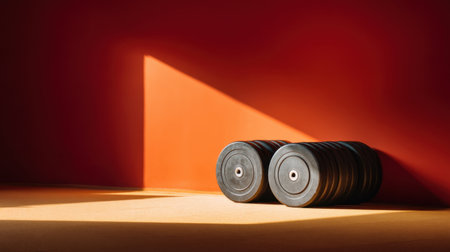 A striking minimal setup featuring black weight plates against a vibrant light orange background highlights fitness and workout themes. Ideal for inspiration.