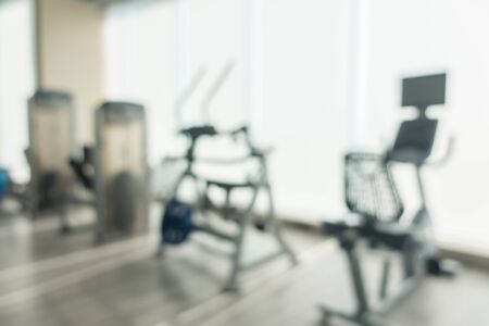 Abstract blur gym room interior with fitness equipment for background
