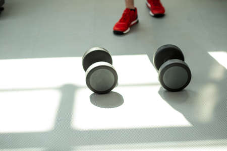 Dumbbells for fitness and sneakers on mat. Gym accessories. Copy space. Selective focus.