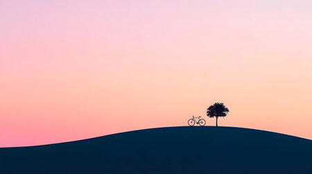 A solitary bicycle rests beside a lone tree, silhouetted against a breathtaking gradient sky of soft pinks and purples at sunset. The rolling, dark blue hills create a minimalist, serene landscape, evoking a sense of journey, freedom, and peaceful solitude. The scene is tranquil and contemplative, perfect for themes of adventure and reflection.