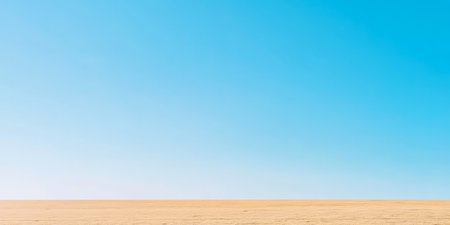 Vast stretches of golden sand meet an endless clear blue sky creating a serene and tranquil atmosphere in this desert location. The bright daylight enhances the natural beauty.