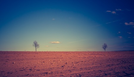 Plowed field, early autumnal landscape. Photo with vintage mood effect