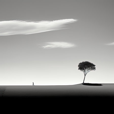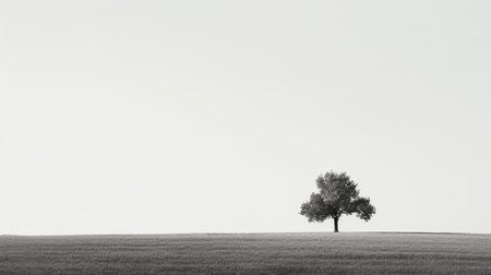 Solitary Tree in Open Field: Minimalist Black and White Landscape for Contemplation