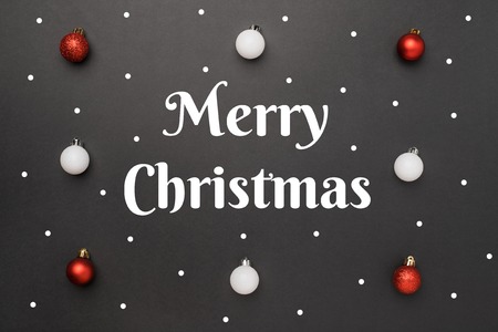 Christmas red and white balls on black background. Flat lay. Festive concept.