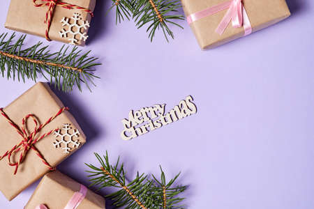 Christmas gift boxes with fir branches on purple paper background with copy space
