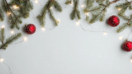 Modern Christmas background layout with pine branches, subtle ornaments, and glowing fairy lights.