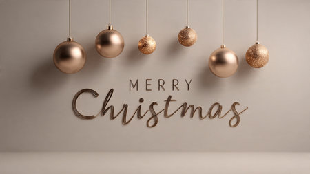 Merry Christmas greeting card with golden baubles hanging on the wall