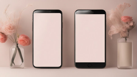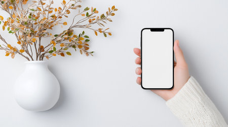 One hand showcases a black smartphone featuring a blank screen with a modern frameless design against a clean white background, highlighting its sleek appearance. Generated AI