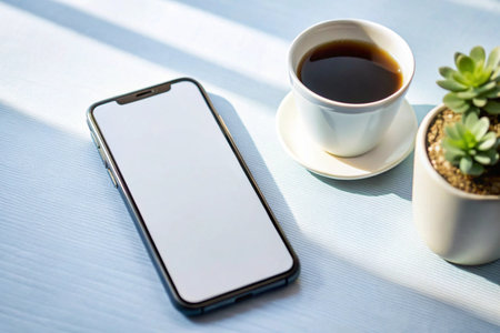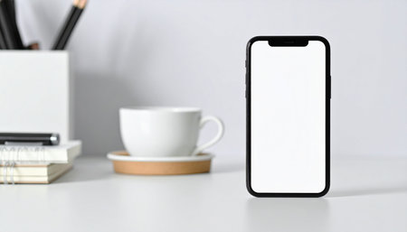 A modern smartphone with a blank white screen stands upright on a white desk next to a white coffee cup and saucer.