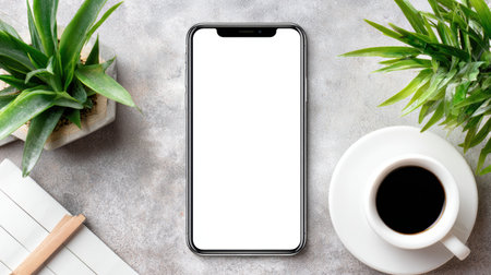 A smartphone rests on a gray desk alongside a cup of coffee and small plants, creating a serene workspace atmosphere during the day.