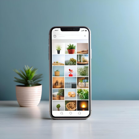 Modern mobile phone mockup showcasing a social media app with a grid layout displaying diverse images. Ideal for representing social media. app design. or online platforms.