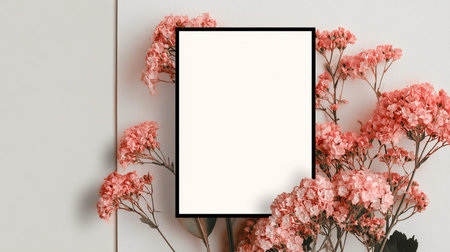 Landscape wooden frame mockup with copy space for artwork, photo or print presentation. White wall and vase with dry gypsophila flower decoration. Minimalistics interior design.
