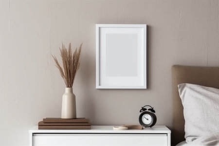 Modern interior, a sideboard with a white chest of drawers against a light gray wall background. A mockup frame for artwork or a poster in a black color frame on the wall. Minimalist home decor, with copy space, a mock-up concept. --ar 3:2 --v 6.1 Job ID: 45bdd154-af4d-41f1-bc30-22b69c5f07cc