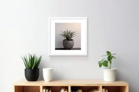 Modern panel with plant in an office room. Minimalist black frame mockup on white background for the design of advertisements. Square frame against a wall.