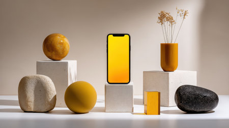 A stylish arrangement featuring a smartphone surrounded by geometric objects in warm yellow and earthy tones, showcasing modern minimalism and artistic flair.