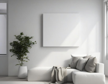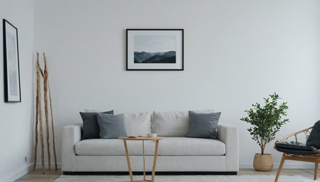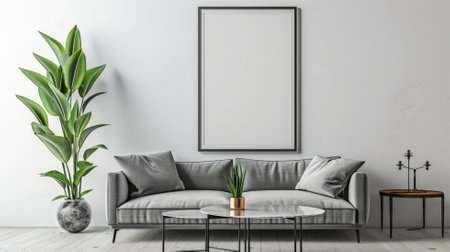 An empty poster frame on a white wall in a minimalist living room interior, with a cozy gray sofa, a sleek coffee table, and a potted plant.