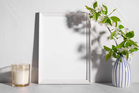 Empty white frame mockup with cherry tree blossoms in vase and scented candle on the table. template for lettering, text or design