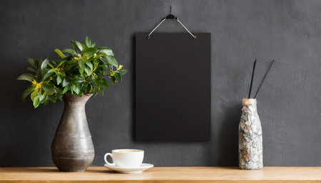 an empty blank white sheet, flower pot, and coffee cup sit on a wooden table in the style of minimalist canvases. this 8k 3d image showcases a dark beige color palette with graphic arrangements and detailed foliage. the eye-catching composition combines elements of industrial and product design. ai generated
