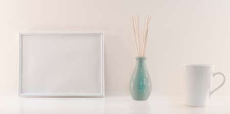 White photo frame template with empty space for logos, advertising inscription. Landscape frame on a workspace with a mug. Zen atmosphere.