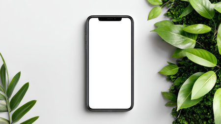 Modern smartphone placed on light surface surrounded by fresh green leaves and natural decor elements for minimalistic and eco-friendly theme