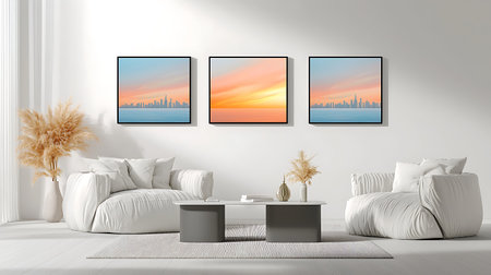 A stylish living room showcases a modern couch and serene abstract landscape art, creating a calm atmosphere ideal for relaxation and inspiration.