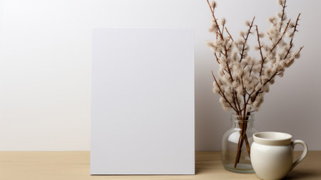 Minimalist mockup white frame card template background decorated with a mug and a dry branch Generative AI Illustration.