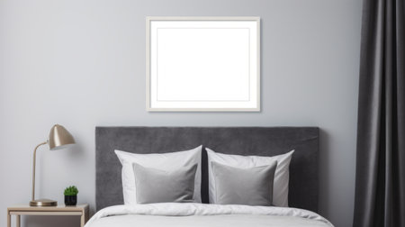the bed features an oversized framed picture mockup with a minimalist color field design in light beige and silver. the artwork, inspired by frostpunk and mcdonaldpunk, showcases a minimalist composition with typography elements. the canon af35m camera captures the details of this unique art piece. ai generated