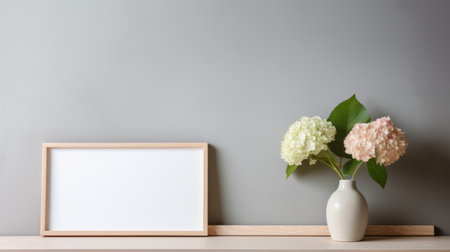 a floral arrangement featuring a blank cardboard frame and an empty vase, adorned with hydrangeas and hibiscus flowers. this minimalist image showcases a gray color palette, complemented by a wooden backdrop. with its eye-catching details and light gray tones, this high-resolution (8k) photograph is sure to captivate. ai generated
