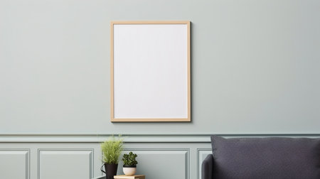 Modern Scandinavian style living room interior, wooden picture frame, poster mockup. Pastel colors. Elegant stylish minimal home decor. Generative AI
