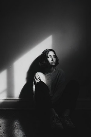 A somber teenager positioned in the corner of a dim room, emphasizing loneliness and mental burden through shadows and minimal light.