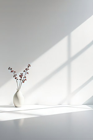 White vase with flowers on a white wall with shadows from the window