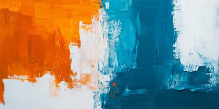 This is a striking piece of abstract artwork that features dynamic brushstrokes in vibrant orange, blue, and white