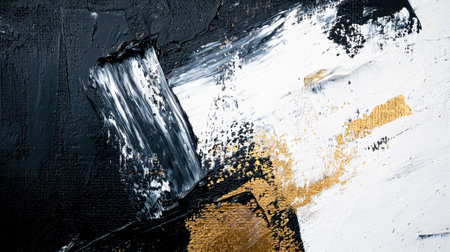 This artwork showcases a striking composition of deep black and bright white paint, accented with shimmering gold. The bold brush strokes create a sense of movement and depth.