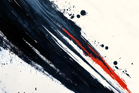 Abstract brush strokes of black ink on textured white background create a striking visual contrast