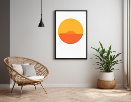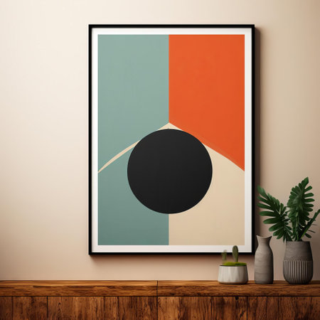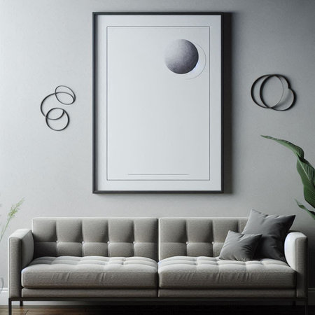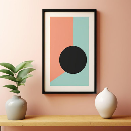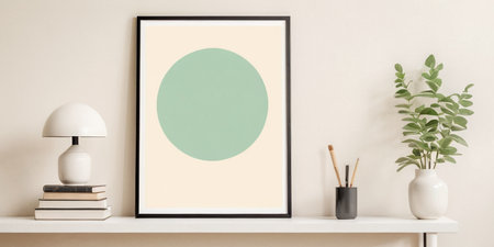 A tranquil living room showcases a framed artwork featuring a soft green circle.