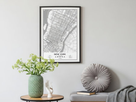 Modern living room with new york city map and decorative accents