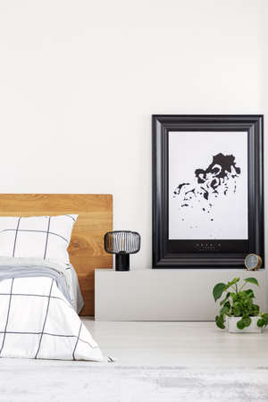 Elegant bedroom with white wall and chequered bedding