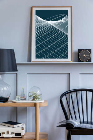 Stylish scandinavian living room interior with design black chair, wooden console, air plants, book, decoration, mock up poster on the shelf and elegant accessories in modern home decor.